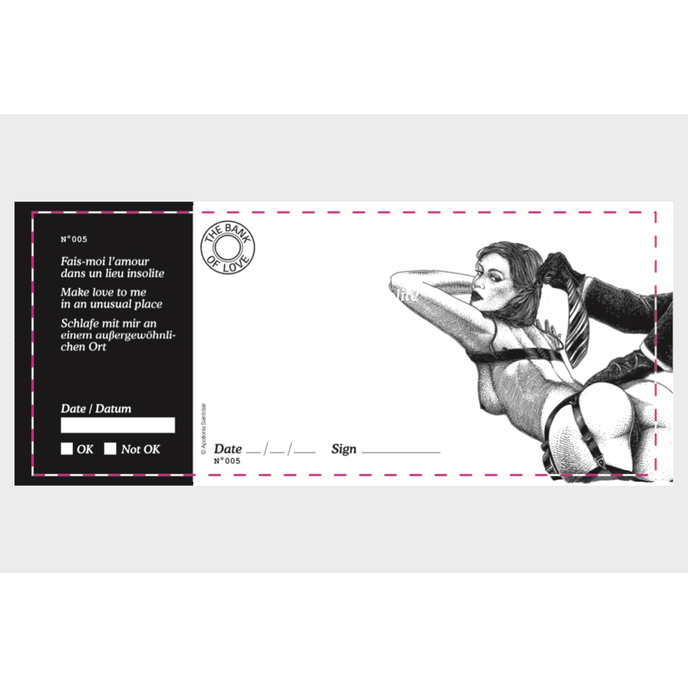 Il contient également 3 chèques entièrement vierges où vous pourrez laissez libre court à votre imagination et y inscrire vos fantasmes pour les réaliser par exemple.