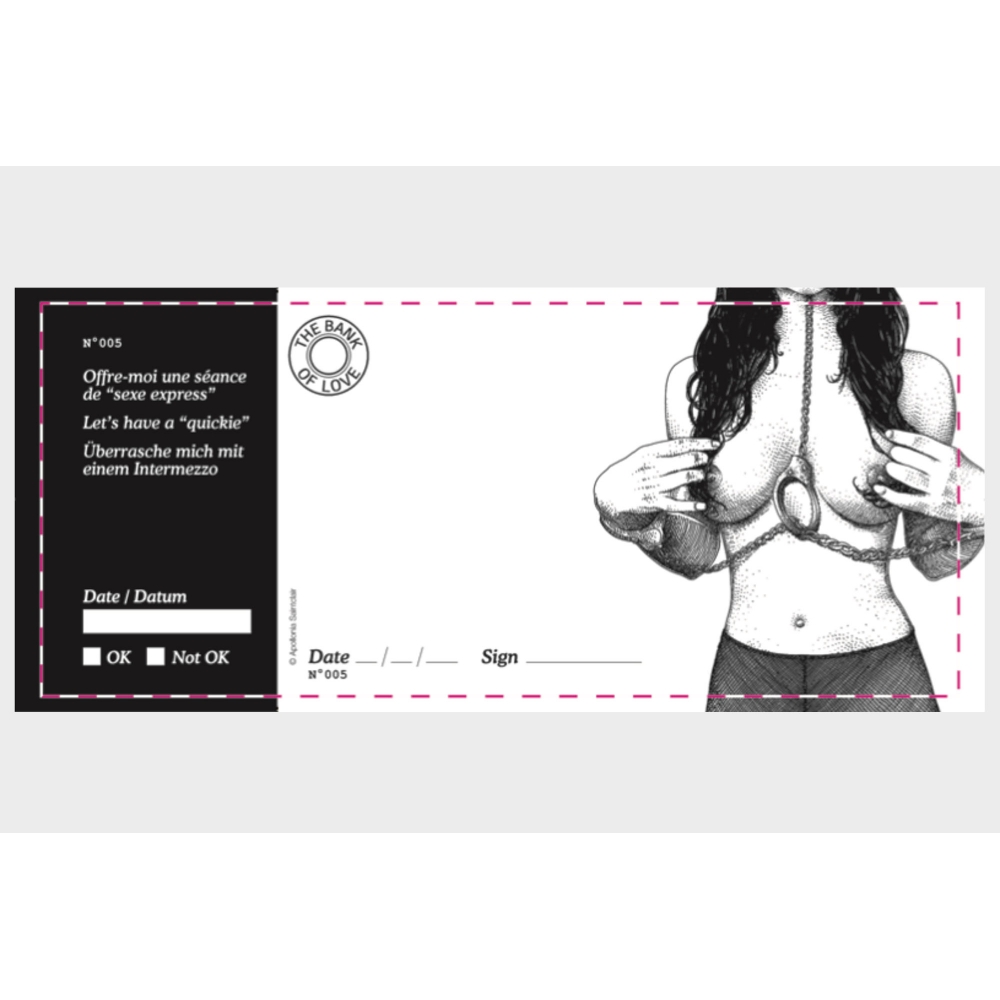 Il contient également 3 chèques entièrement vierges où vous pourrez laissez libre court à votre imagination et y inscrire vos fantasmes pour les réaliser par exemple.