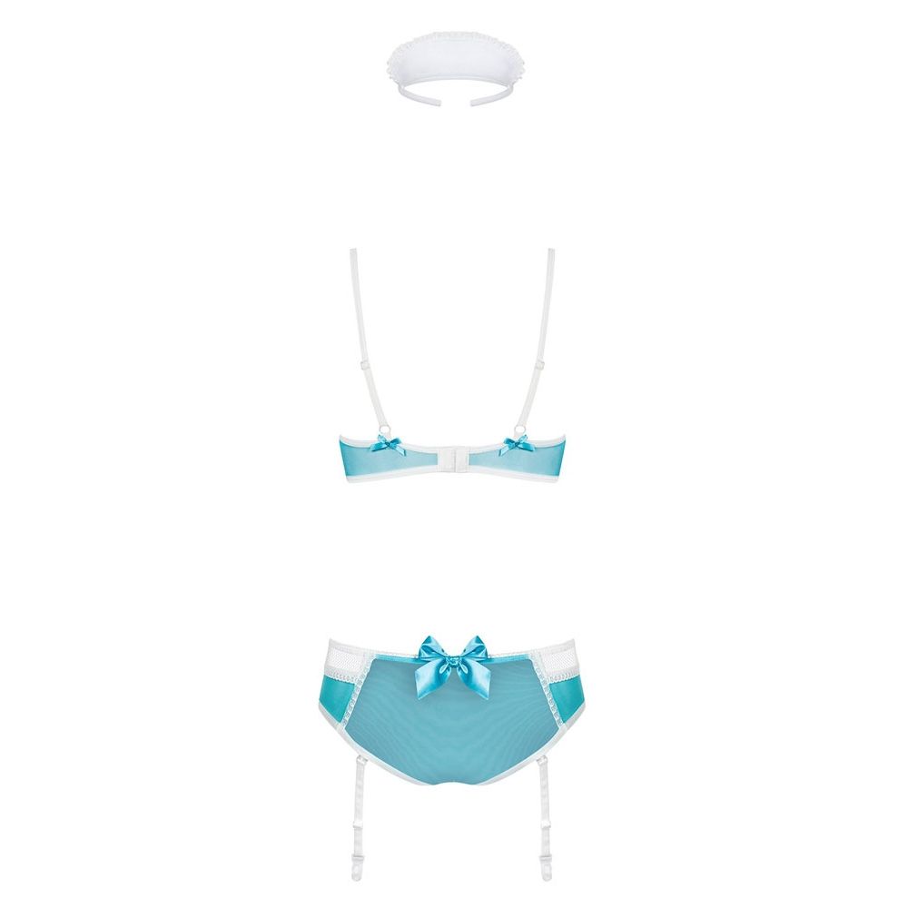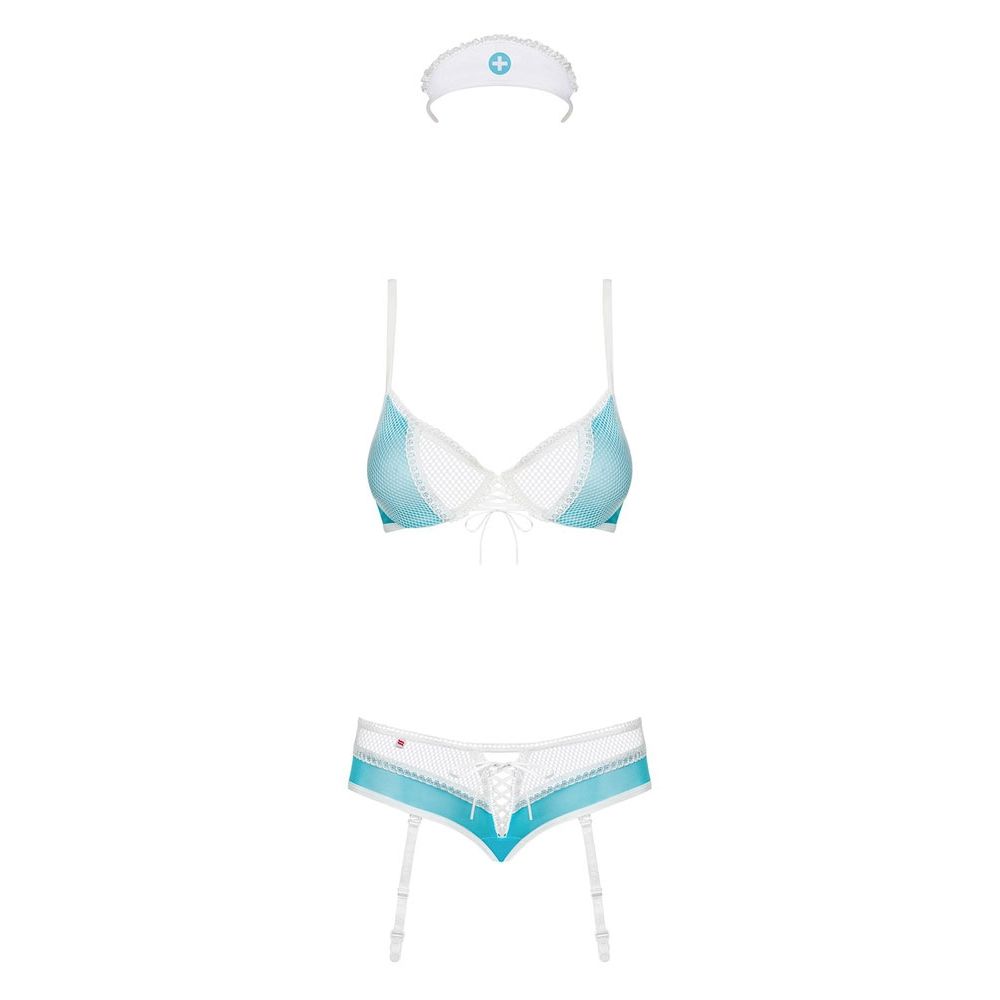 Surprenez votre partenaire avec le joli Déguisement Infirmière Sexy S/M de la marque Obsessive.Vous n’aurez plus qu’à enfiler votre « blouse » pour soigner votre partenaire, malade de désir !Ce magnifique ensemble bleu et blanc qui revisite le costume traditionnel d’infirmière  vous permettra de vous démarquer par votre originalité et surtout votre sensualité !Le mélange de maille fine et de lacets apportent une touche très sexy à votre costume qui le fera craquer à tous les coups.Votre ensemble comprend: